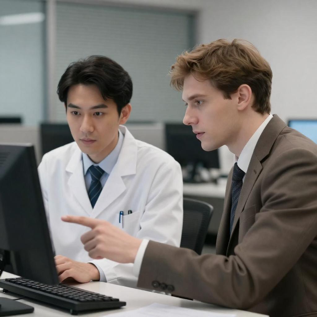 Photograph of two men in an office setting. The man on the left has dark hair, medium skin tone, wearing a white lab coat and dark tie, looking at the computer. The man on the right has light brown hair, fair skin, wearing a brown suit jacket, pointing at the computer screen. Both men are focused on the computer. Background includes metal grid windows and office equipment.
