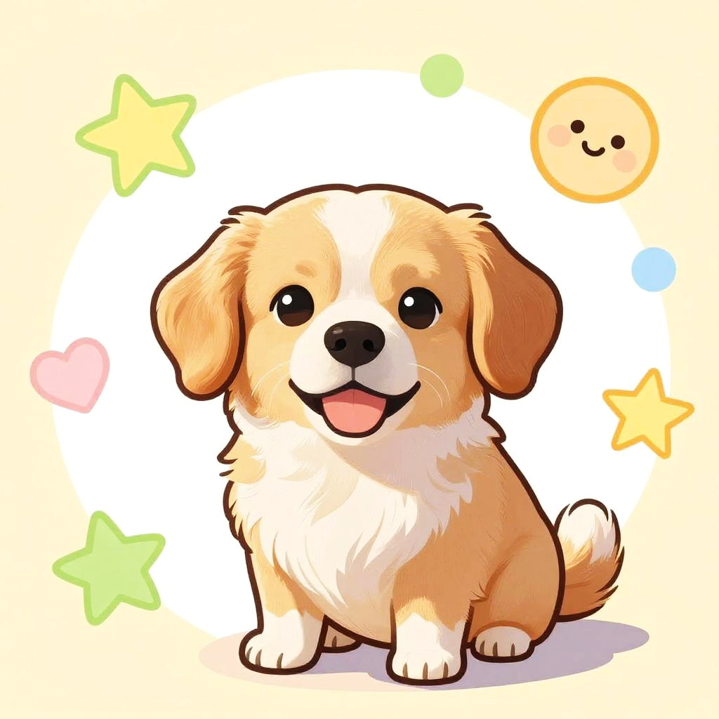 This image is a digital collage of four vibrant, pixelated artwork panels, each featuring a young Asian girl with short black hair, wearing different outfits and playfully interacting with dogs. The top left panel has her in a white dress with a red sash, surrounded by dogs on a red floor. Top right shows her in a blue dress, jumping mid-air with a dog. Bottom left has her in a red dress, running with a dog on an orange floor. Bottom right depicts her in a yellow dress, surrounded by floating balloons and a dog. The styles are colorful and whimsical.