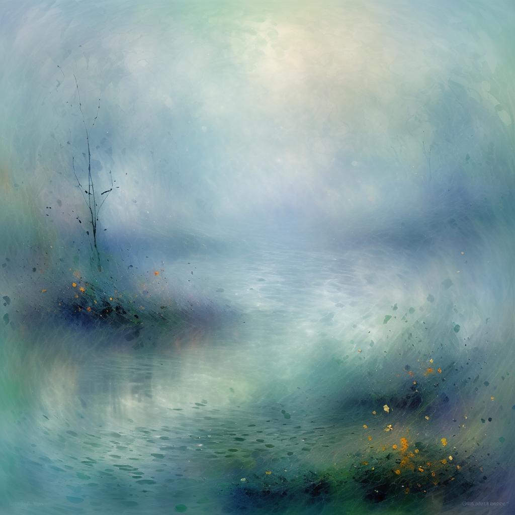 Abstract digital artwork inspired by Claude Monet, depicting lost dreams in a symbolic and chaotic manner. Features blended foggy textures with soft blues, greens, and subtle yellows creating a misty, ethereal atmosphere. Impressionistic style with fluid brushstrokes conveying emotion and mystery.