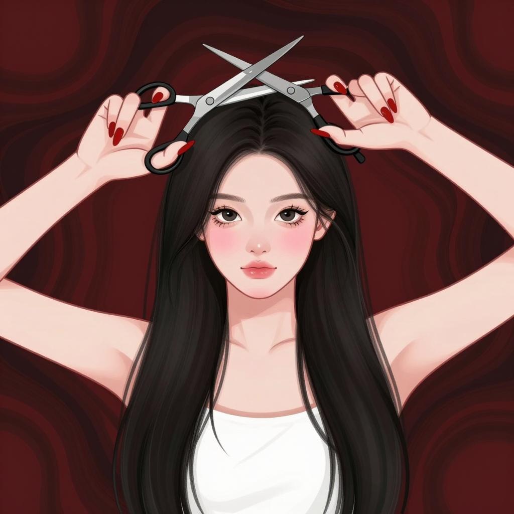 Digital illustration of a woman with long black hair, holding scissors above her head with both hands. She has large eyes, pink skin, and a white sleeveless top. Her nails are painted red. Background features red and black swirling patterns. Her expression is neutral. Her hands and scissors are in the foreground, with her face centered.