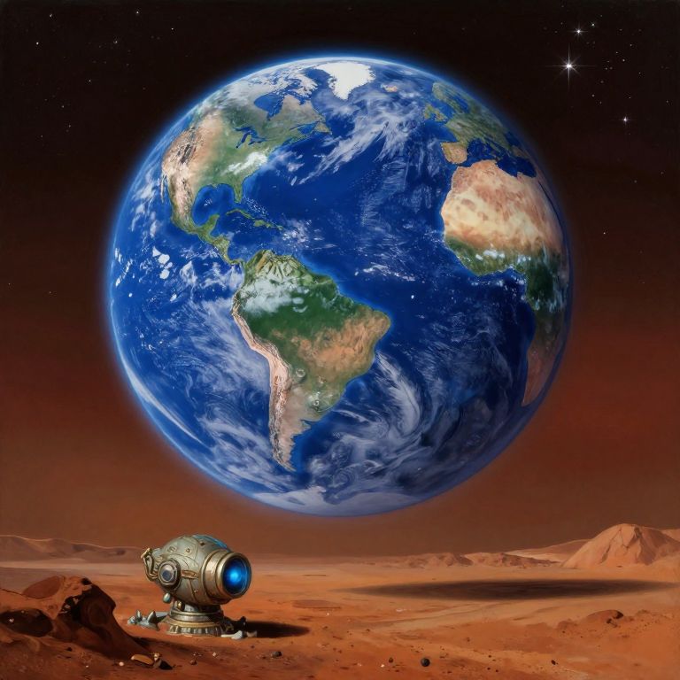 A mesmerizing panorama of Earth from the vantage point of Mars, captured through the innovative lens of a holographic camera in a futuristic setting. The vivid blue orb floats against the stark Martian sky, its continents and seas sharply defined amidst the twinkling stars. This captivating scene features an enigmatic, ancient alien relic nestled among the rusty, dust-laden terrain below, as if guarding Earth's beauty. Rendered in the grandeur of both classical oil painting techniques and digital artistry, this cinematic sci-fi film poster composition stirs a sense of awe and nostalgic yearning for our home planet.