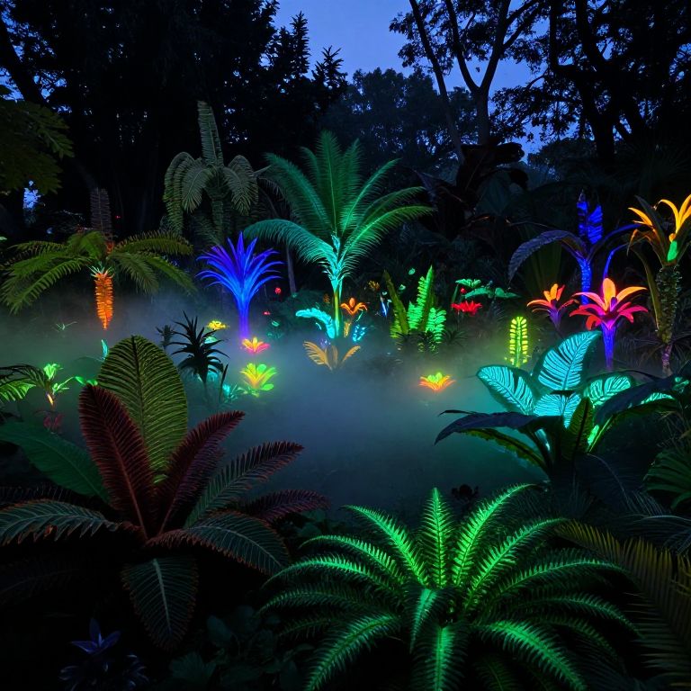 Fluorescente botanical garden at dusk, exotic plants and flowers glowing softly in various fluorescent colors, magical and serene environment, mist swirling around leaves, intricate textures and vivid lighting highlighting the flora