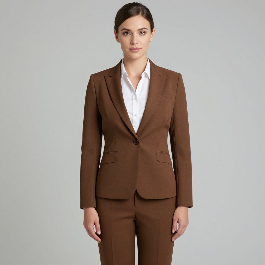 Photograph of a young woman standing against a plain light blue background. She has fair skin, dark brown hair pulled back into a neat bun, and is wearing a brown, tailored, single-breasted suit with a white dress shirt underneath. The suit jacket has a single button fastened at the top, and the pants are straight-cut with two front pockets. She stands with a neutral expression, arms relaxed at her sides. The overall style is professional and polished, with the clean background emphasizing her formal attire.