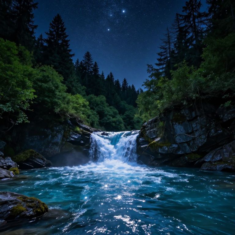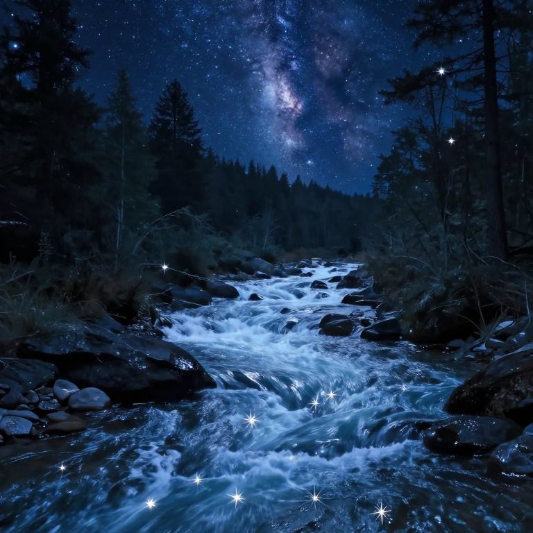Photograph of a nighttime forest scene featuring a brightly illuminated, flowing stream with glowing stars embedded in the water. The stream's white, turbulent water contrasts with the dark, rocky surroundings and dense, shadowy pine trees in the background. The sky is a deep blue, filled with countless twinkling stars and a visible Milky Way, creating a magical, ethereal atmosphere. The photograph uses a long exposure technique to capture the star-like effect in the water, enhancing the mystical, enchanting quality of the scene.