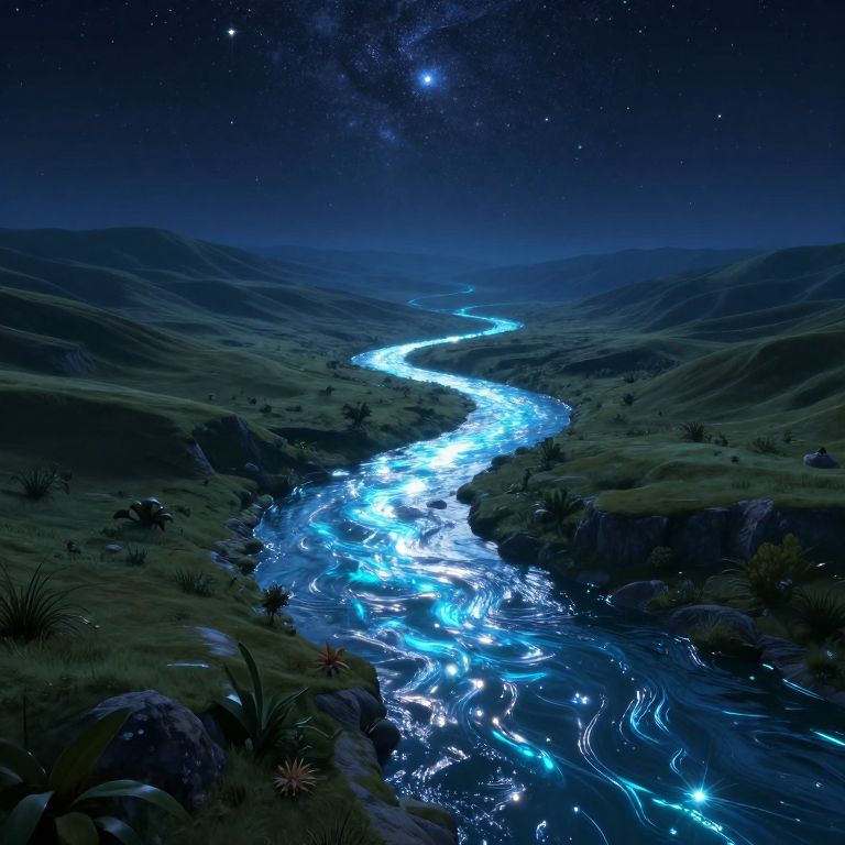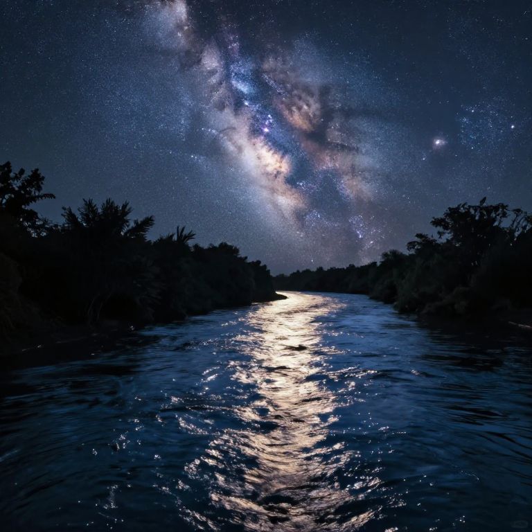 A river flows skyward, its water turned to liquid stars by an ancient spell, sparkling as it ascends into the night.