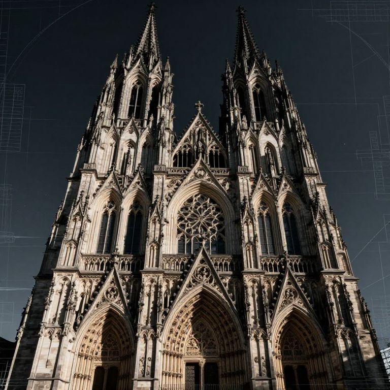 The image depicts a grand, Gothic-style cathedral bathed in a dramatic, volumetric lighting that casts deep shadows and highlights the intricate architectural details. The cathedral's towering spires and elaborate stonework are rendered with hyperrealistic precision, showcasing the intricate interplay of light and shadow. The cathedral's facade features a series of arched windows and ornate carvings, each meticulously detailed to reflect the light and create a sense of depth. The overall composition is balanced, with the cathedral centrally positioned and flanked by dark, shadowy areas that draw the viewer's eye towards the illuminated structure. The scene is devoid of people, emphasizing the grandeur and solitude of the cathedral. The use of ray tracing and particle effects enhances the realism, creating a sense of movement and atmosphere within the image. The blueprint-like quality of the drawing adds a layer of complexity, blending the architectural beauty with the precision of a technical drawing.