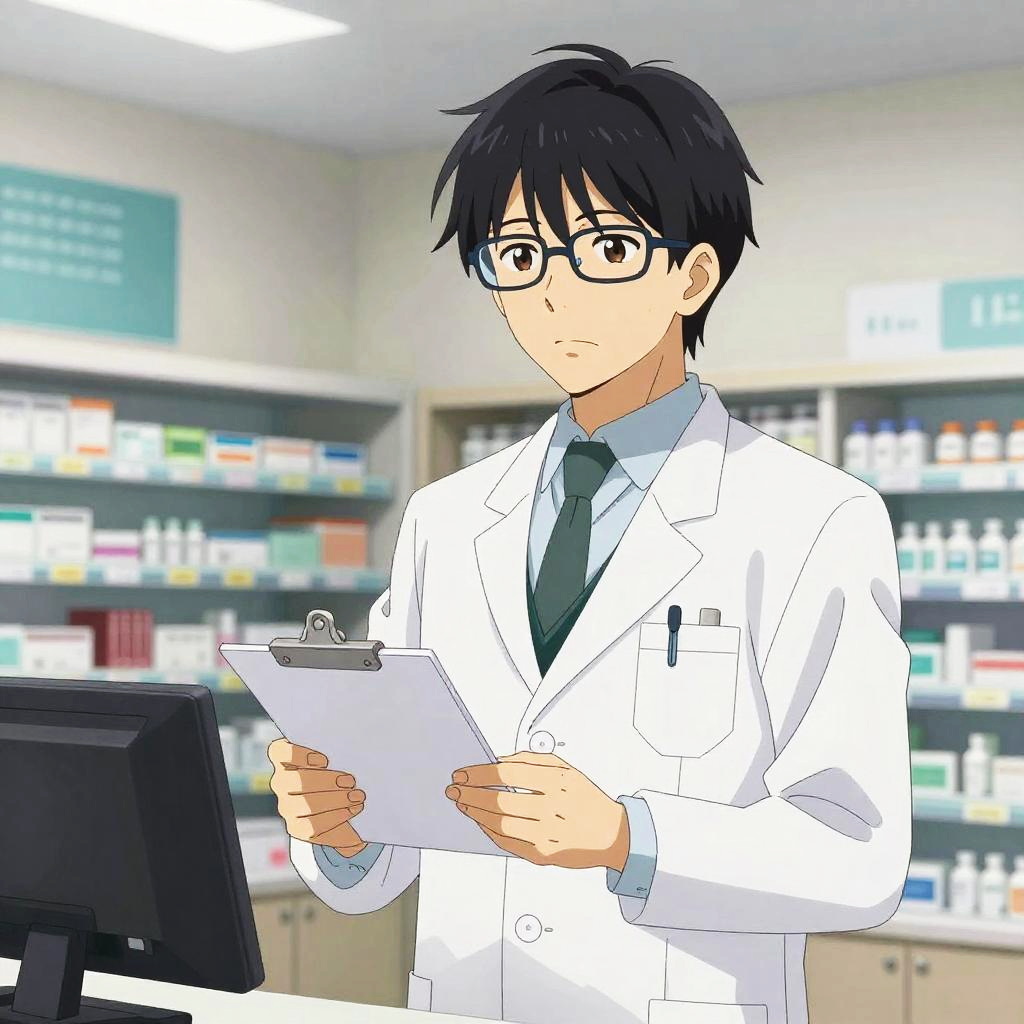 Anime Male Pharmacist in Modern Pharmacy