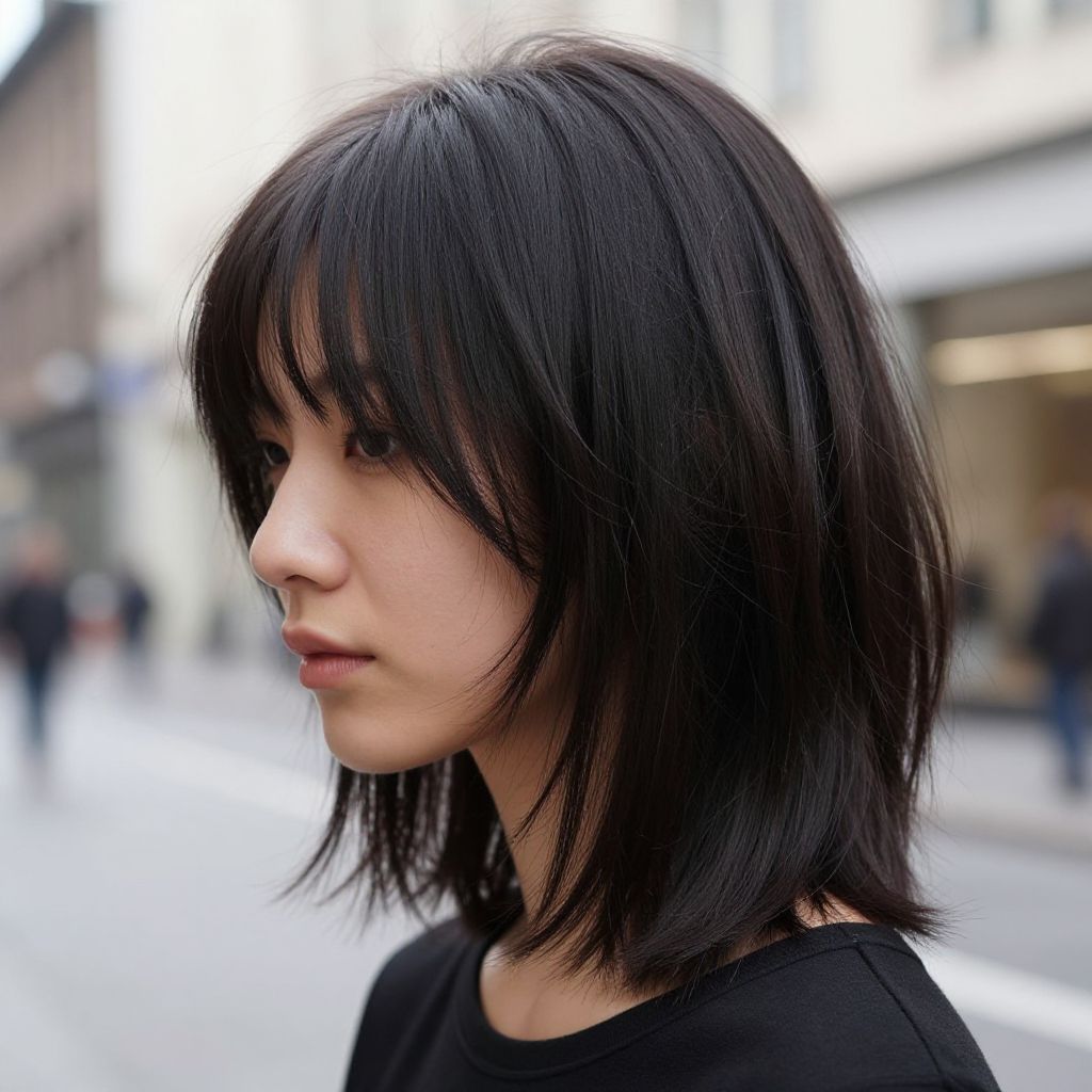 Woman with blunt cut with soft layers hairstyle, a modern take on a classic edgy cut, styled with volume and texture, strong straight hair flowing naturally, urban street backdrop with soft daylight, clean lines and contemporary fashion vibe, detailed close-up showcasing the contrast between sharp blunt edges and flowing soft layers, MidJourney style.