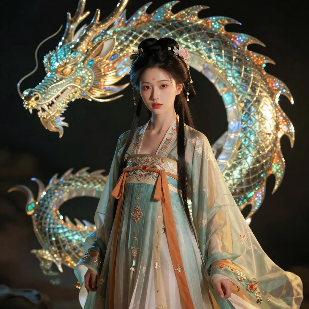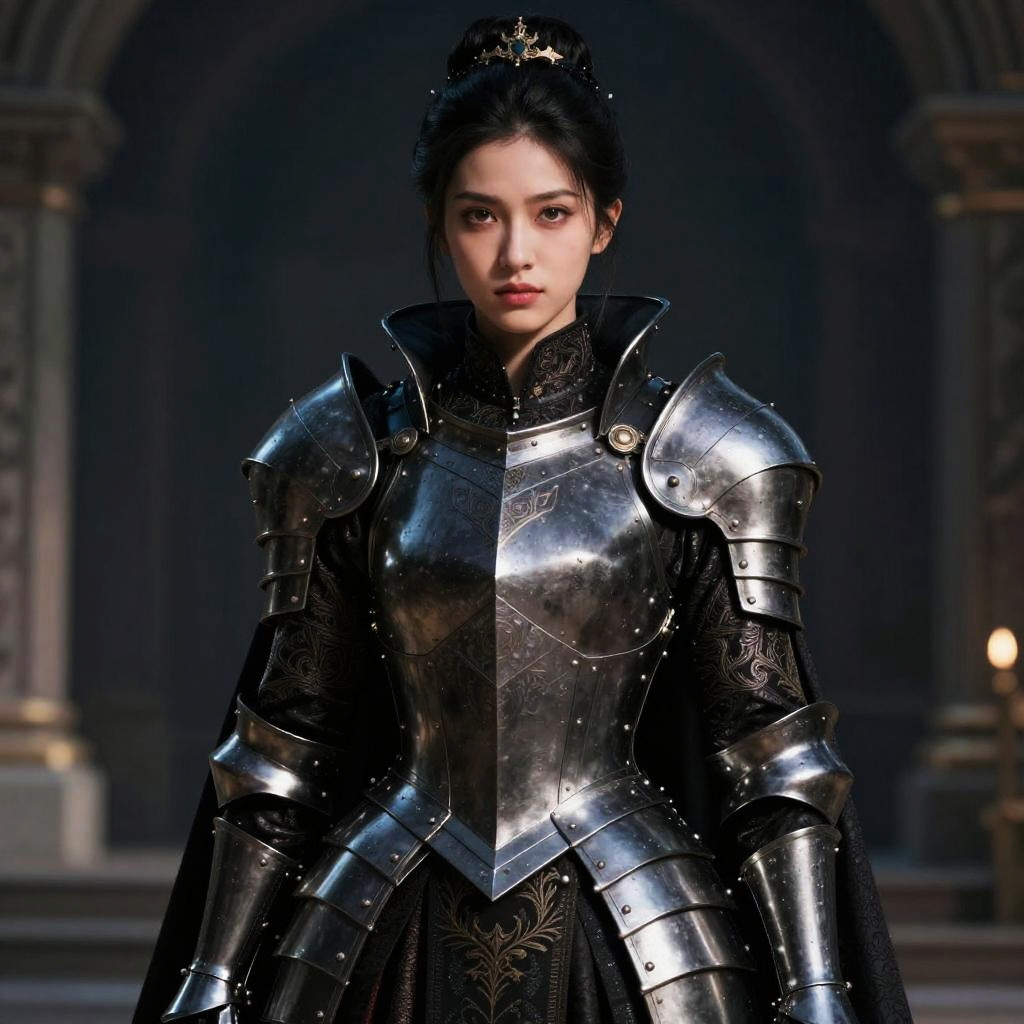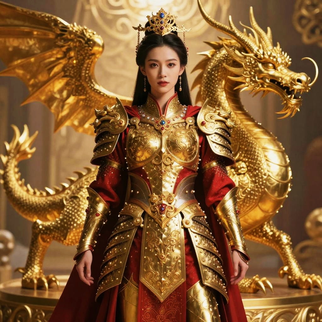A confident woman dressed in intricately detailed golden and red armor stands poised with a majestic golden dragon behind her. The image features a rich fantasy style with elaborate textures and warm, glowing colors, evoking a sense of strength and mythical power.