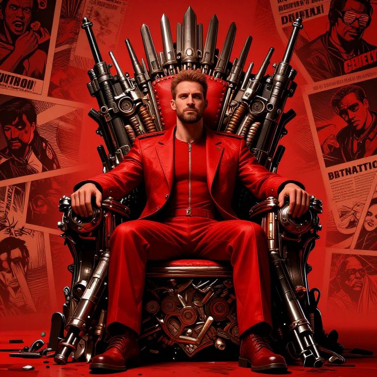 Digital Twin Dr Disrespect sitting on a throne made out of guns, shell casings, comic poster art style, champion, victorious, red,
