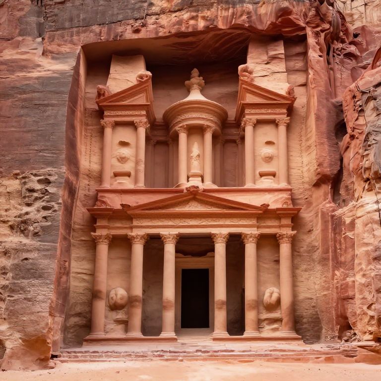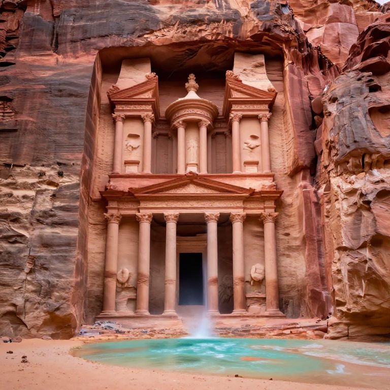 Photograph of a majestic, ancient stone temple with Corinthian columns, nestled in a rugged, red-hued canyon with a glowing turquoise pool at its