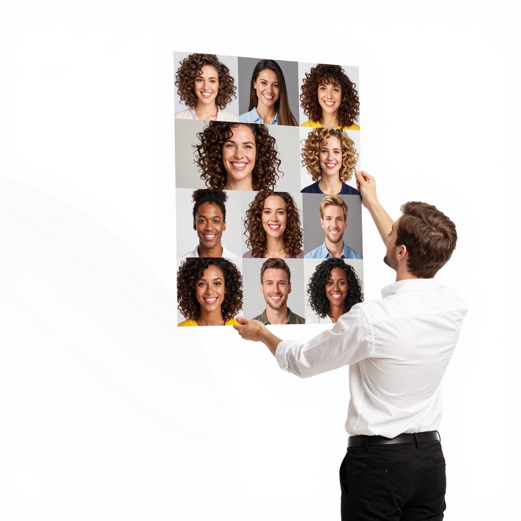 Man in white shirt and black pants reaches up, holding a large collage of photographs. Collage includes various images of a smiling woman with curly hair, smiling faces, and . Background is white with a curved shape on the left. Man's head is tilted upward, facing the collage.