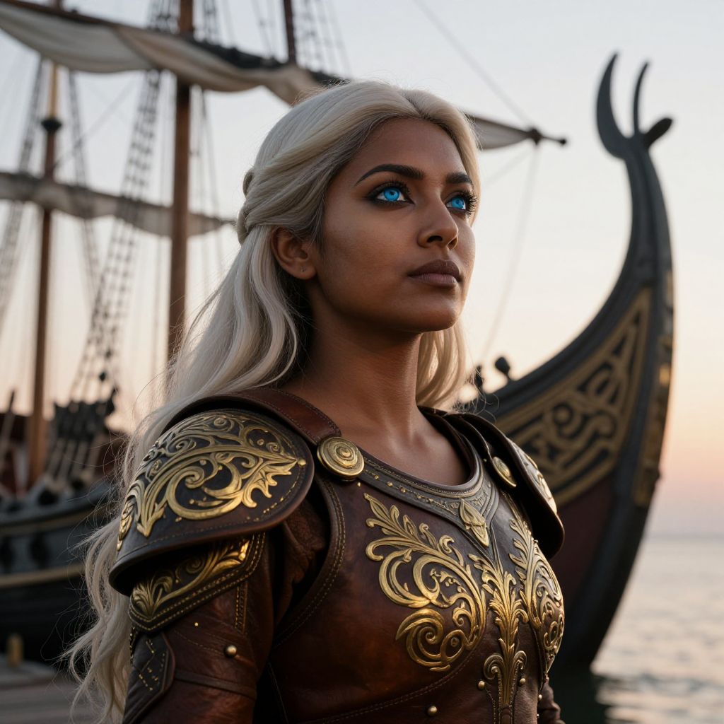 Craft a photorealistic portrait of a South Asian woman with piercing blue eyes and cascading platinum blonde hair, her features exuding strength yet serenity. Capture her from a low angle amidst an ancient Viking shipyard at sunset, the warm light illuminating intricate gold filigree on her leather armor. This image should convey a spectrum of emotions, from stoic determination to quiet reflection, blending nature's raw power with timeless craftsmanship.