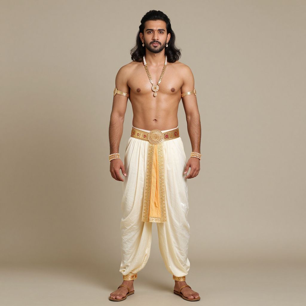 Photograph of a young man with medium brown skin and long black hair, standing against a plain beige background. He has a trimmed beard and is shirtless, wearing a white dhoti with gold embroidery around the waist and cuffs. He also wears gold arm and waist bands, a long necklace, and brown sandals. His physique is lean and muscular, and his expression is neutral. The overall style is traditional and regal, evoking a historical or cultural aesthetic.