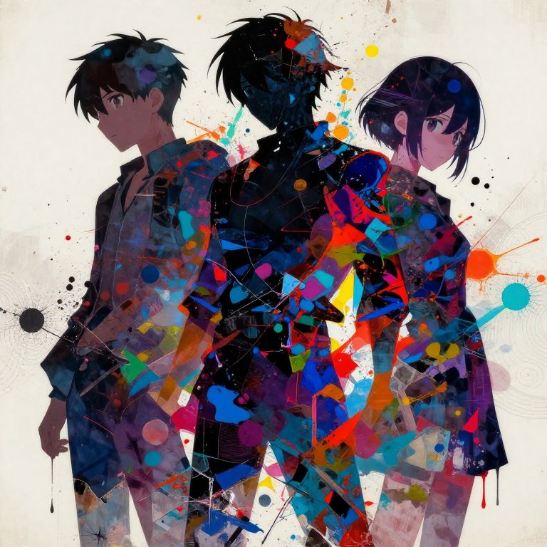 This digital anime-style illustration features three silhouetted characters with dark hair, standing closely together against a white background. The characters are partially obscured by vibrant, abstract splashes of color including red, blue, yellow, and green. The leftmost character is a young man with short hair, wearing a collared shirt. The middle character has messy, medium-length hair and stands slightly in front, while the rightmost character is a young woman with short hair and a slightly turned head. The colorful splashes create a dynamic, energetic effect, contrasting with the dark silhouettes. The overall style is modern and vibrant, with a focus on contrast and abstract elements.