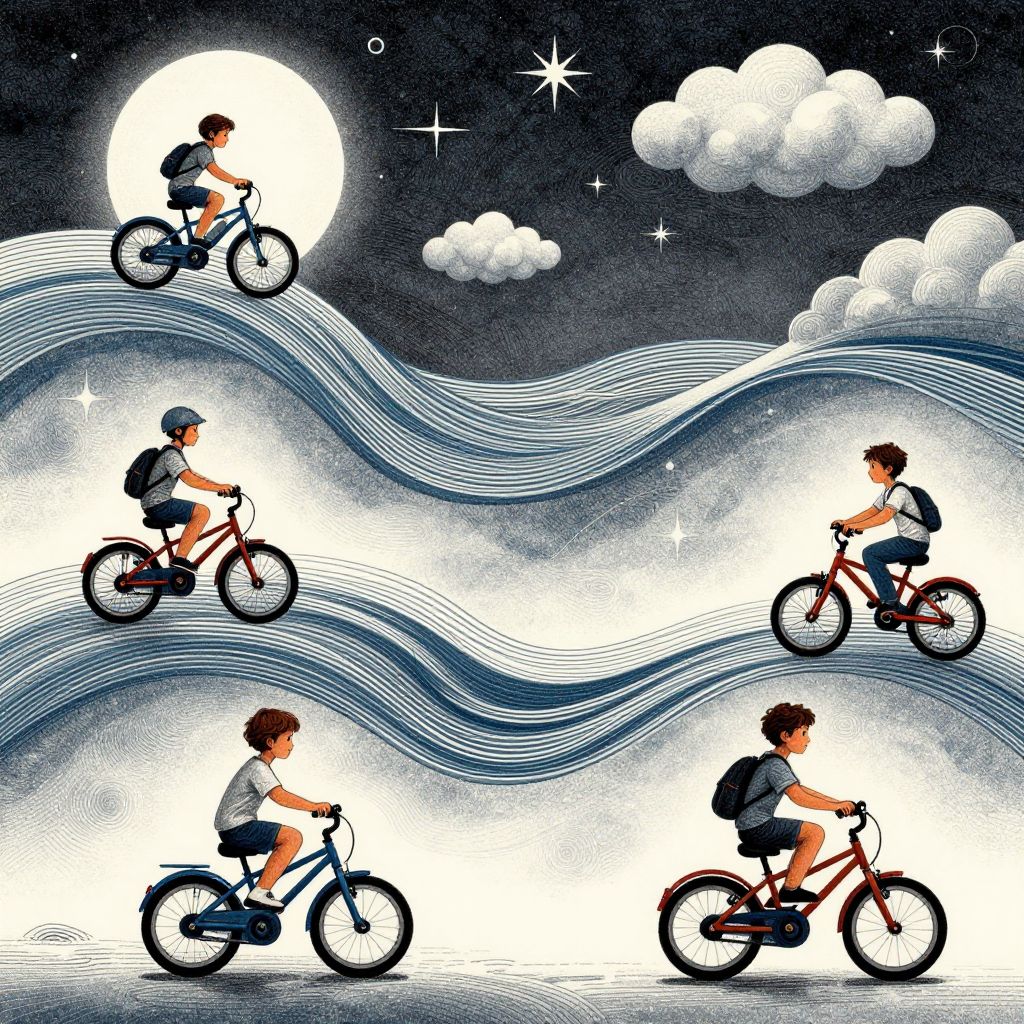 Children fly bicycles through skies full of gravitational currents, learning physics as abstract art by riding the invisible currents of emotion and thought.