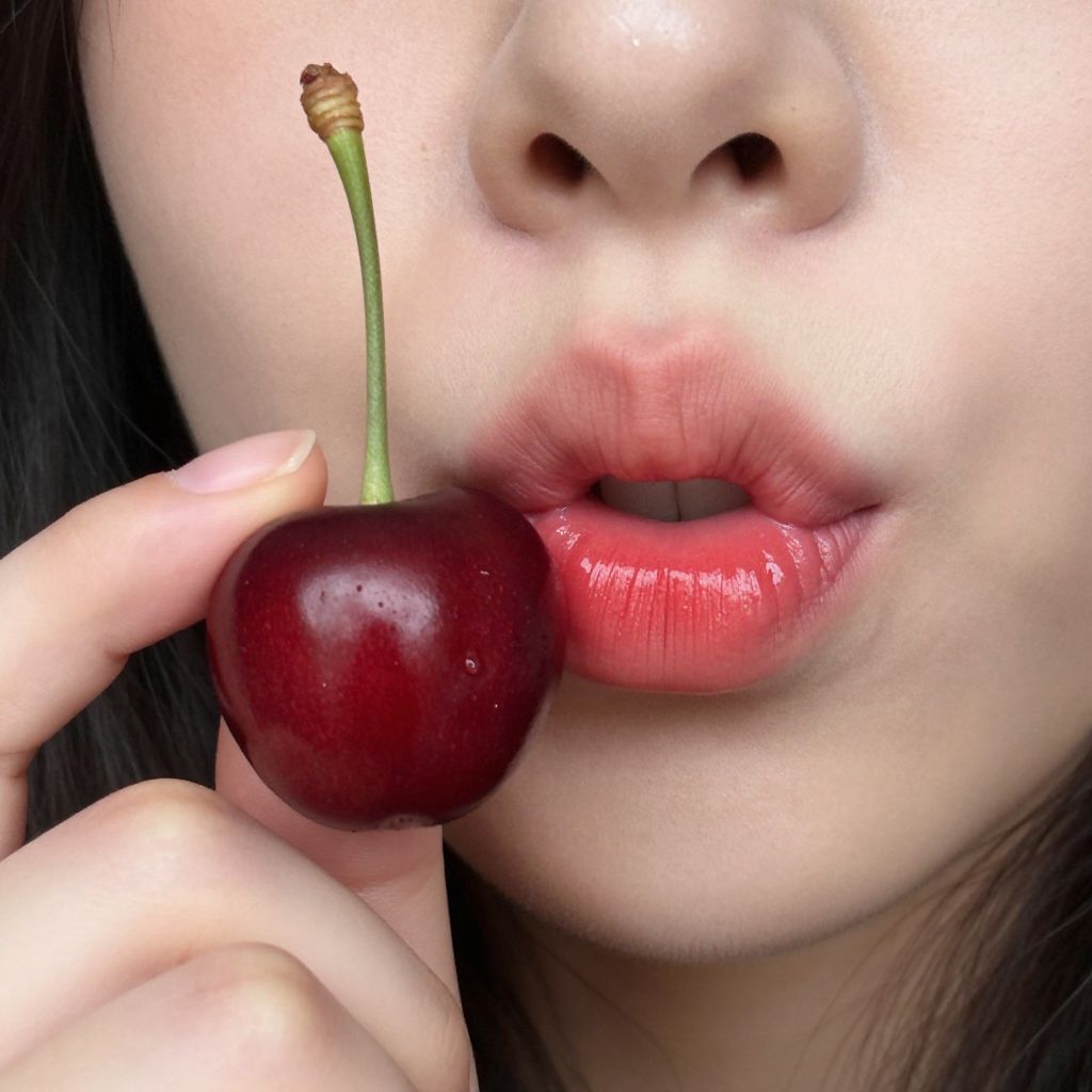 This photograph is a close-up of an Asian woman's face, focusing on her lips and chin. She has fair skin and is holding a dark red cherry with a green stem close to her slightly parted, glossy red lips. Her right index finger gently touches the cherry's stem. The background is blurred and dark, making her skin and the cherry stand out. Her lips are full and shiny, contrasting with the smooth texture of the cherry. The image has a high contrast, vibrant color palette, and a slightly surreal, exaggerated style, emphasizing the cherry and her lips.