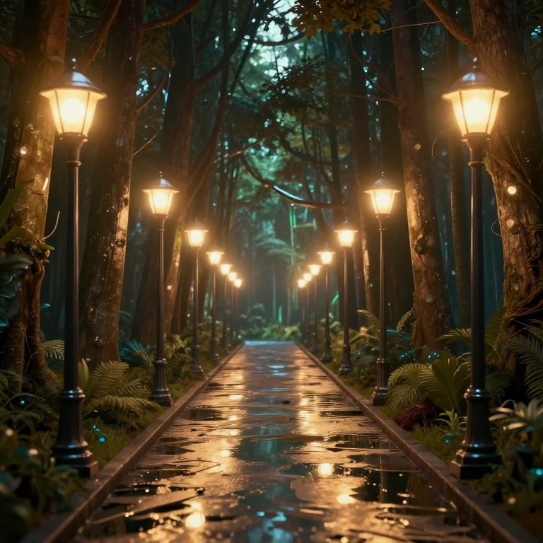 A cyberpunk-inspired 3D render depicts a surreal forest pathway lined with glowing streetlamps, their warm light reflecting off mirrored surfaces that create an infinite, alternate reality effect, evoking a high-definition, otherworldly atmosphere.