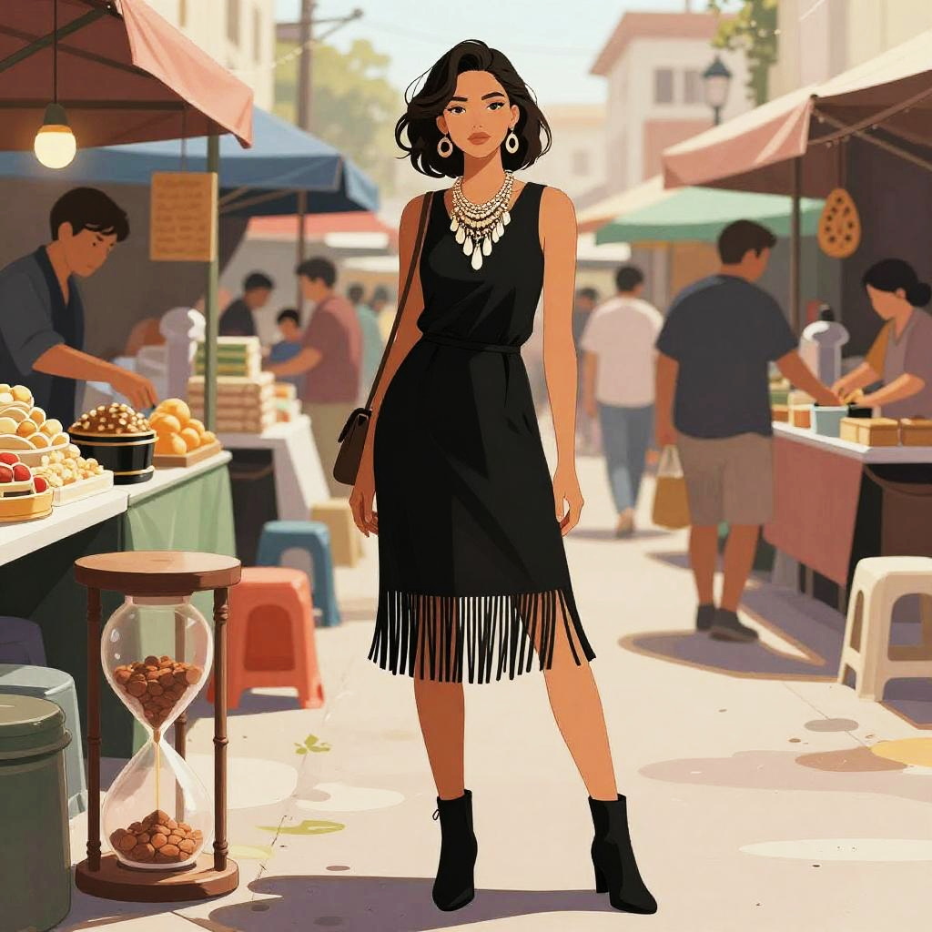 A hourglass woman in a modern bohemian sleeveless black dress with a fringe hemline, paired with ankle boots and a statement fringe necklace, stands in a vibrant street food vendor setting in a bustling market, illustrated in the style of NBM graphic novels. Sexy. Pretty face and beutiful eyes