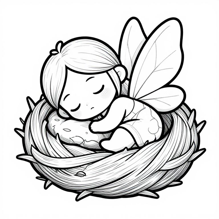 Black and white line drawing of a chubby fairy with closed eyes, sleeping in a detailed, textured bird's nest.