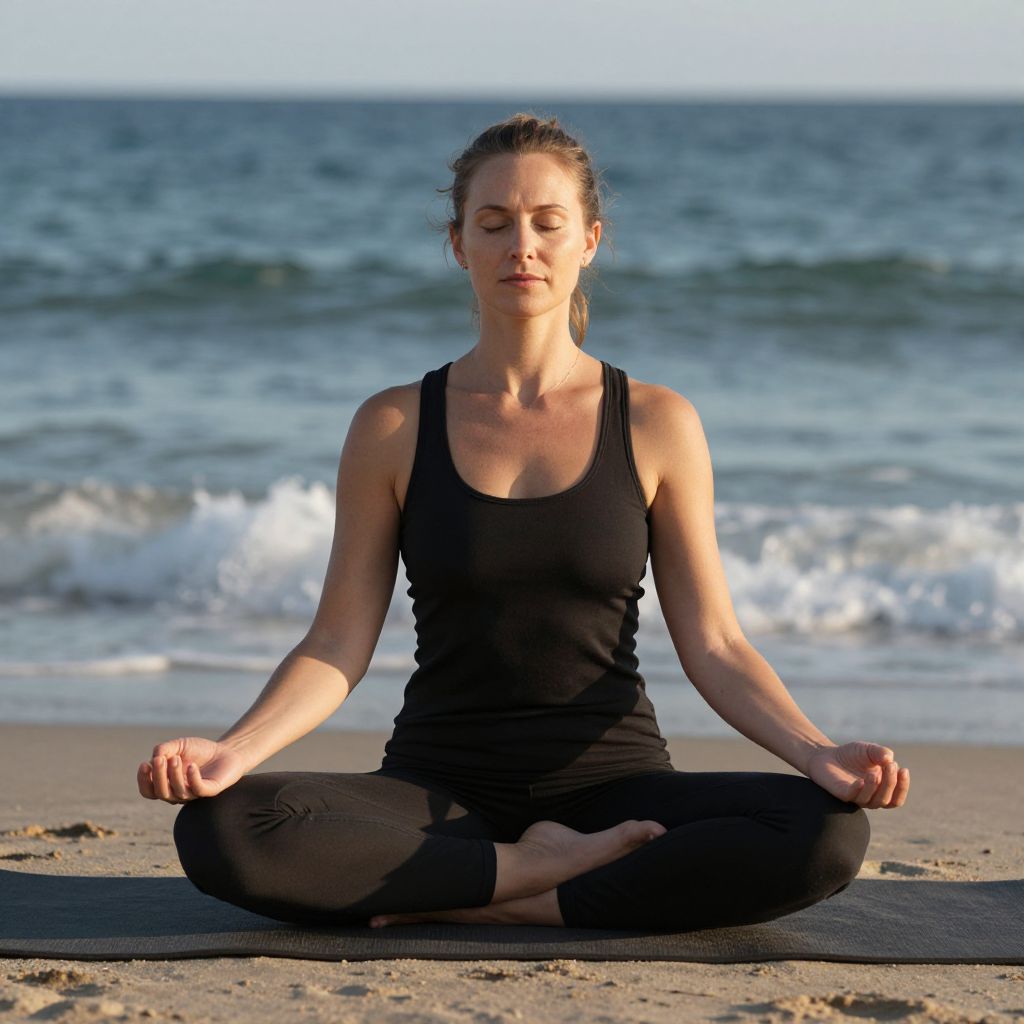 Serenity unfolds as a woman in black meditates by the sea, her pose a testament to inner peace, while the gentle hum of waves and the warmth of the sun evoke a profound connection to the timeless rhythm of nature.