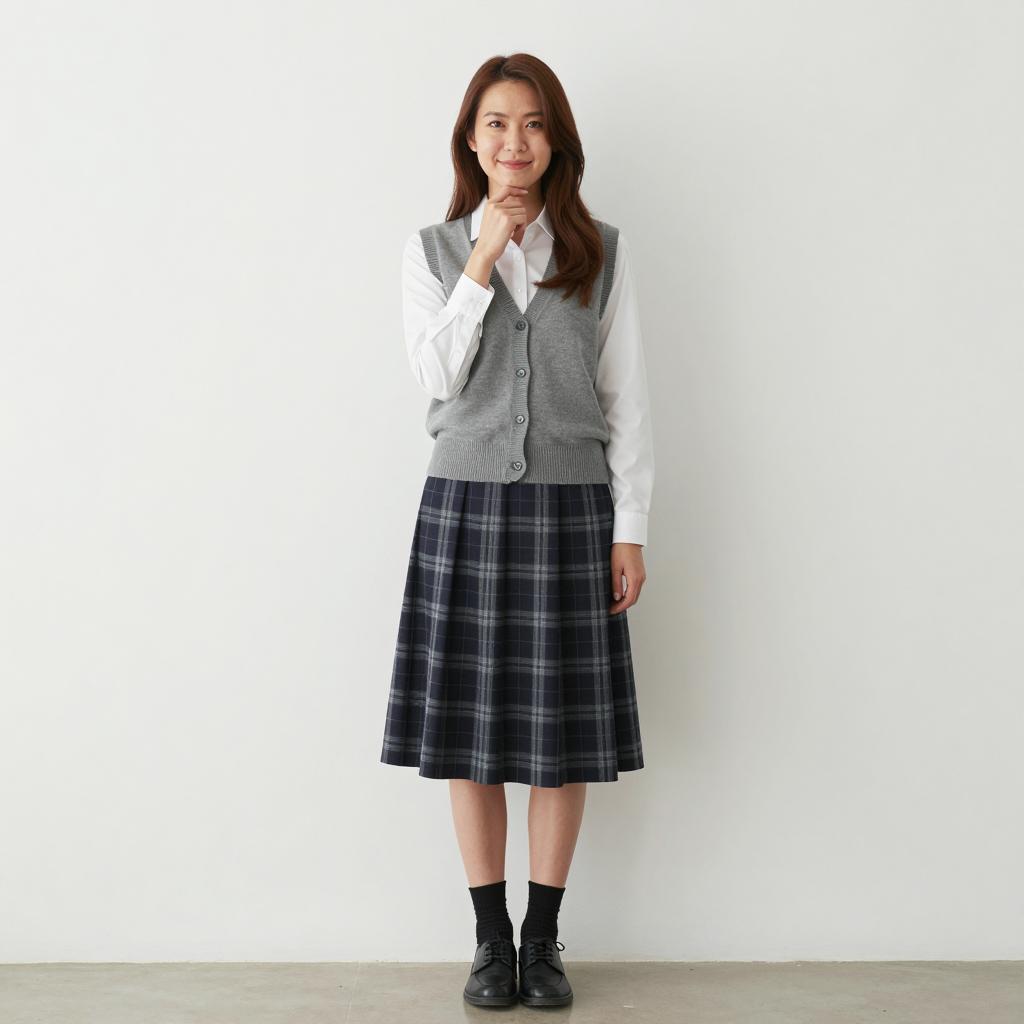 Portrait of an Asian woman with long brown hair standing against a plain white wall. She is wearing a grey sleeveless vest over a white button-up shirt, paired with a dark blue and grey plaid skirt, black socks, and black shoes. She poses with her right hand touching her chin and a slight smile, standing with legs slightly apart.
