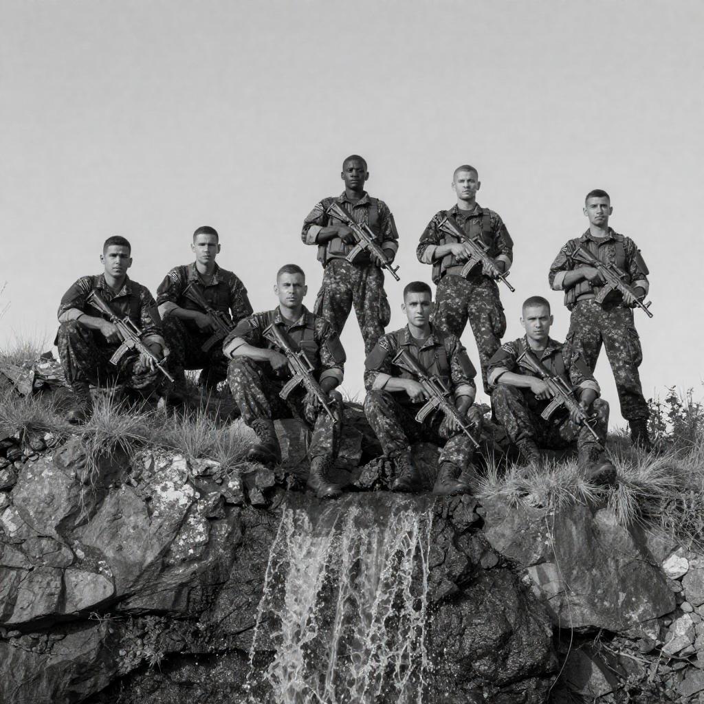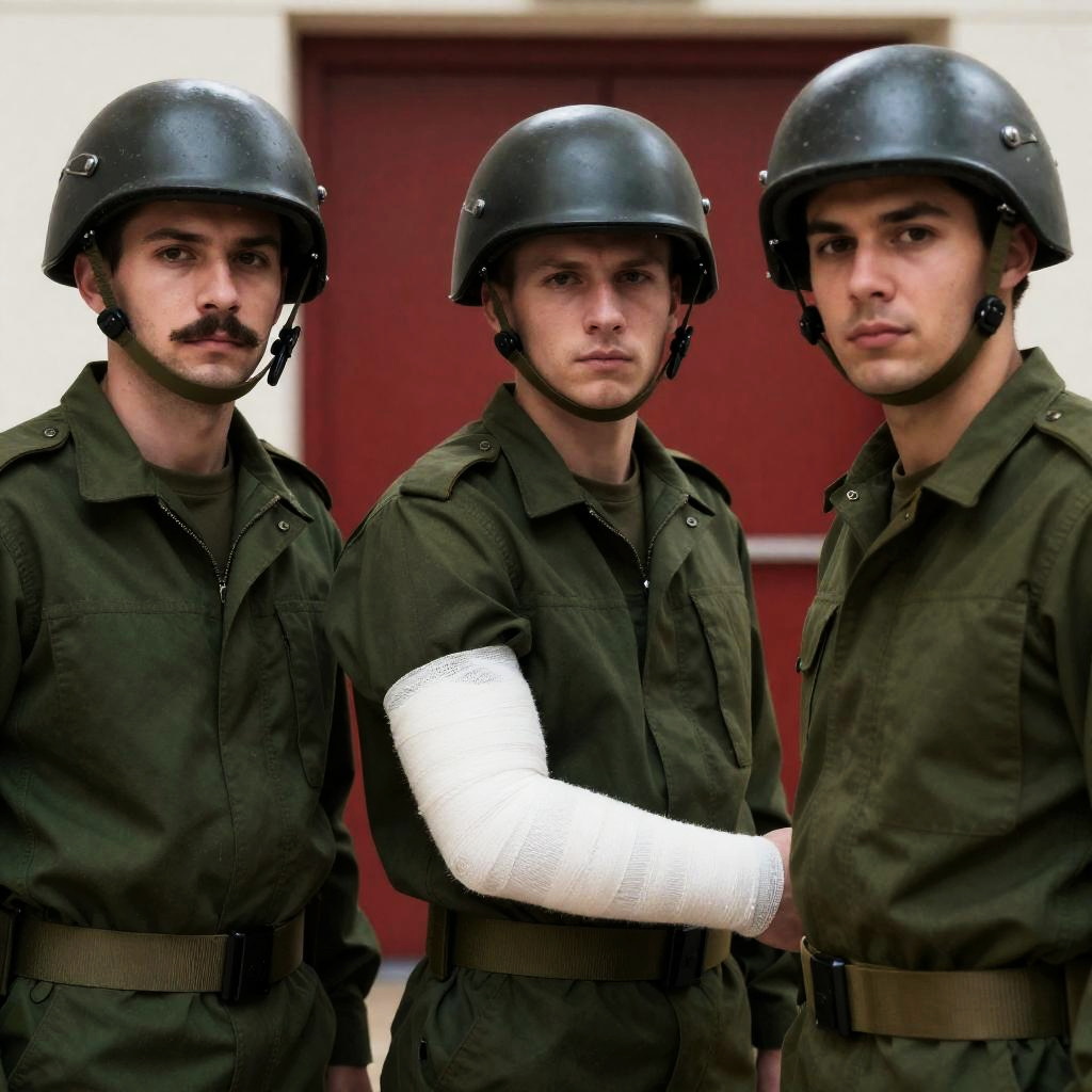Photograph of five young male soldiers in dusty, olive-green uniforms and hats. They sit and stand closely together, arms around each other. Sandbags in background, dry shrubs behind. Three holding rifles, one standing with arm around another, one smiling. Casual, relaxed poses. Sunlight highlights their faces. One soldier with short, light brown hair, others with short, dark hair. Facial expressions: smiling, relaxed.