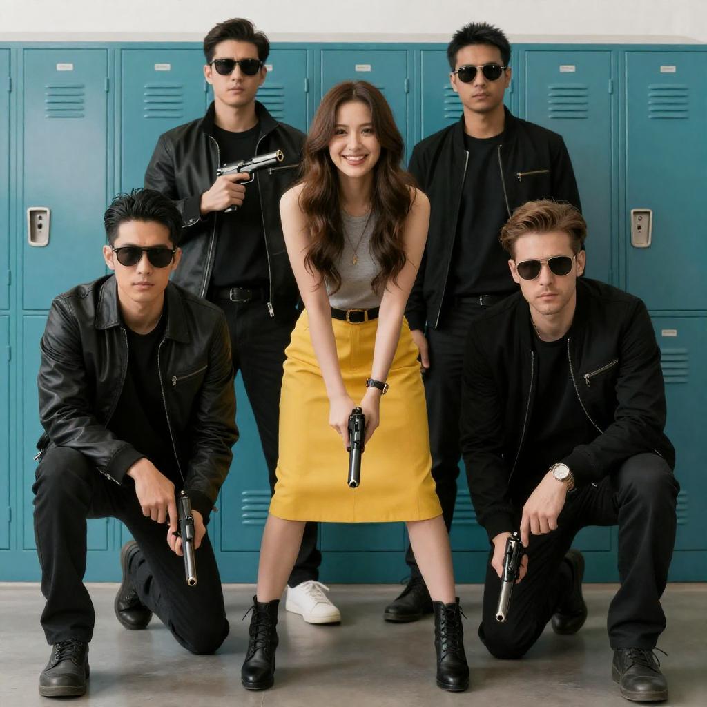 Photograph of five people in front of turquoise lockers. Four men in sunglasses and black jackets, holding guns, crouch. One woman with long brown hair, yellow skirt, and gray top, leaning forward. Men have intense expressions, woman smiles. Lockers in background.