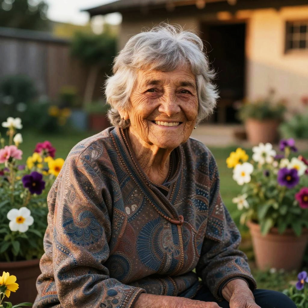 Portrait of an elderly woman with a vibrant smile, wrinkles showing stories of life, warm golden hour lighting, sitting in a rustic garden filled with blooming flowers, natural textures and rich colors conveying wisdom and happiness
