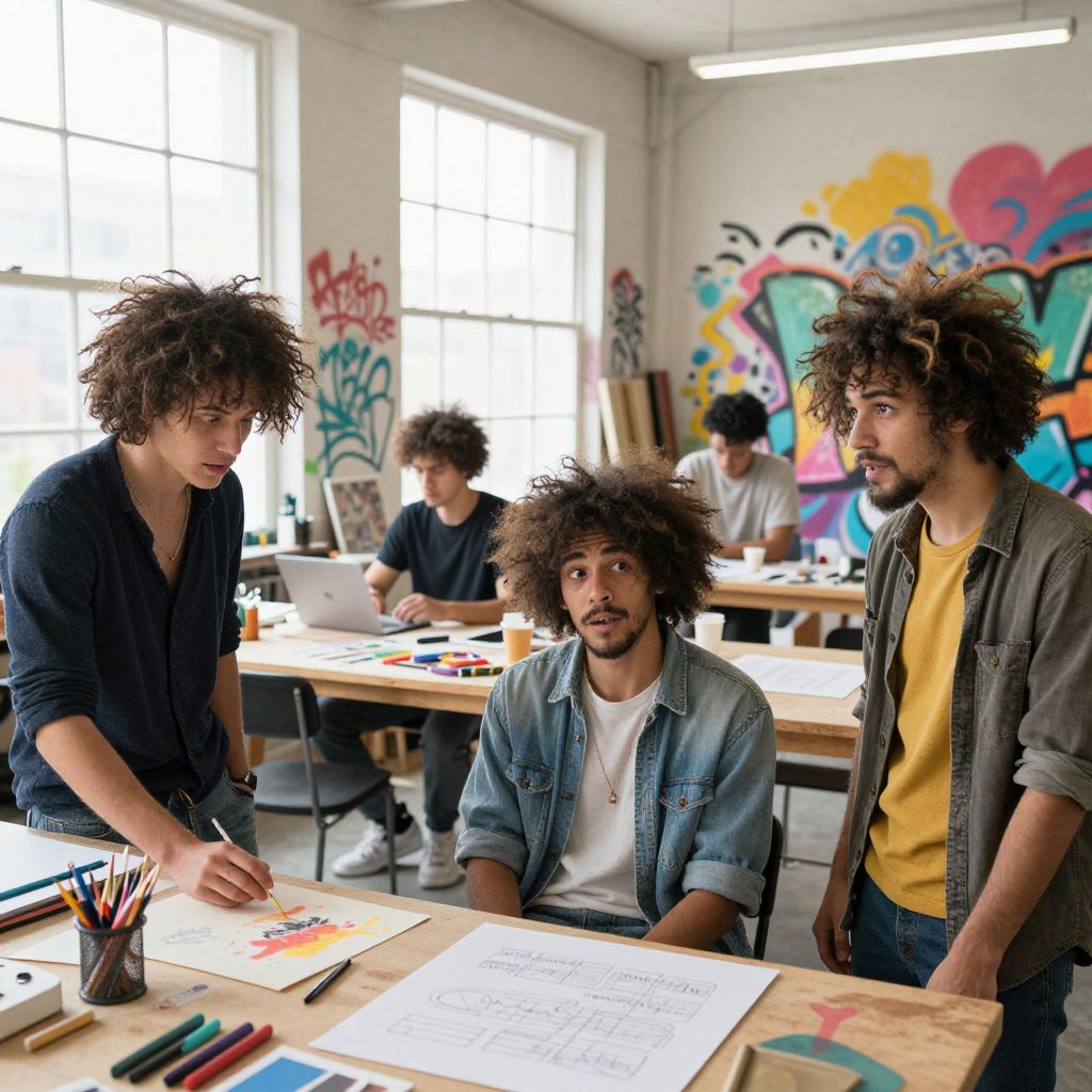 Photograph of a brightly lit classroom with four young men of diverse ethnicities, all with voluminous, curly brown hair. Three are seated at wooden desks with laptops and art supplies; one stands, handing a sheet of paper to the central figure. The standing man wears a black shirt; the central man, a denim jacket over a white tee; the man on the right, a yellow tee with a gray jacket. The background features large windows, colorful graffiti on the wall, and another seated student. The room has a modern, creative atmosphere with natural light streaming in.