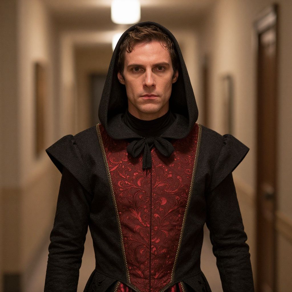 Photograph of a Caucasian man with fair skin and short brown hair, standing in a dimly lit, beige-toned hallway. He wears a black hooded garment with a high, structured collar and a red, intricately patterned, buttoned front. The black fabric has a textured, slightly shiny appearance, contrasting with the smooth, matte red fabric. His expression is serious and focused. The hallway has blurred, rectangular framed pictures on the walls and a wooden door on the right. A bright, overhead light creates a focal point above his head, casting soft shadows. The overall style is reminiscent of Gothic or medieval fashion.