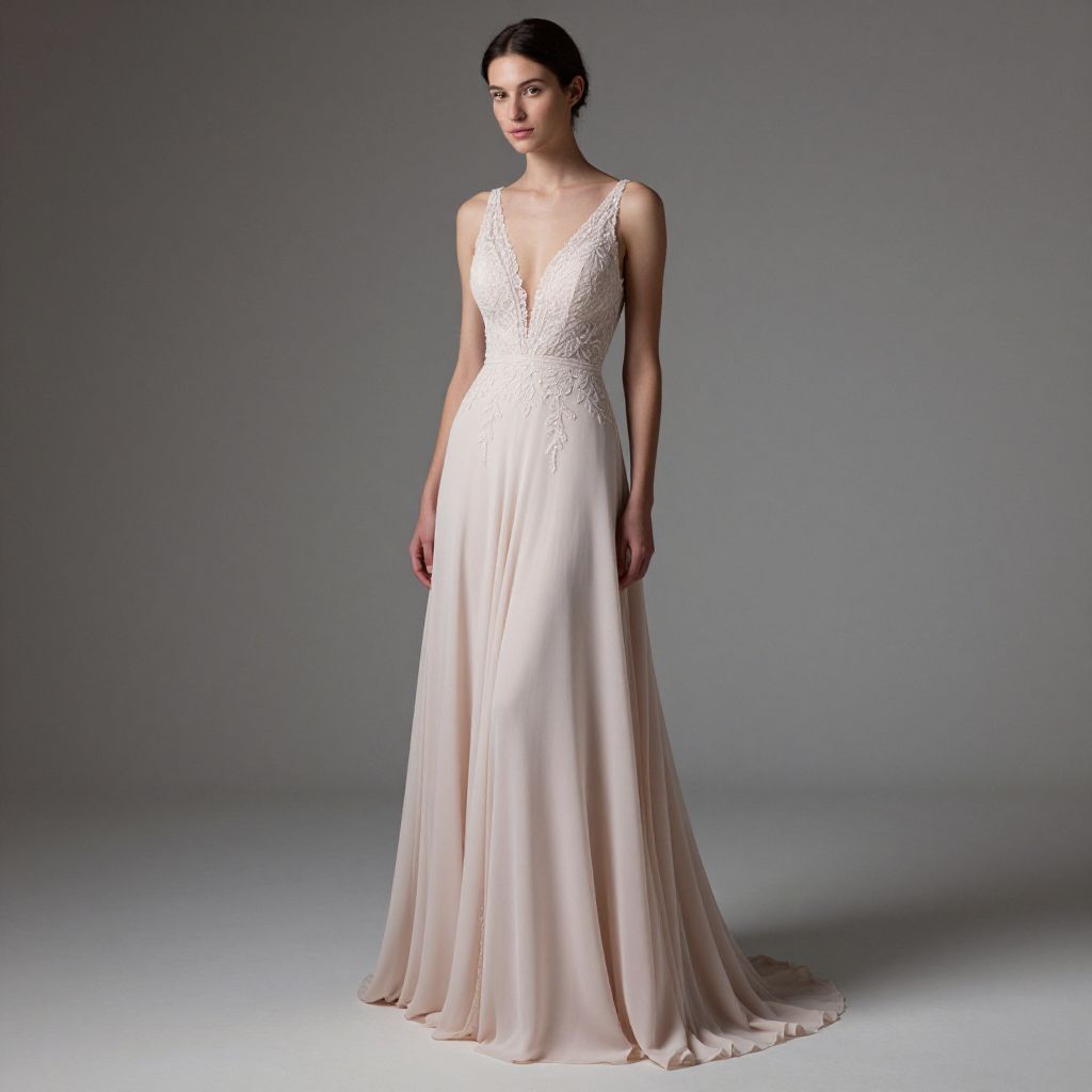 Photograph of a woman with wavy black hair standing against a plain gray concrete wall. She's wearing a long, flowing white gown with thin straps and a gold-embellished V-neckline. The dress has a slight sheen and drapes elegantly to the floor. She stands confidently with a neutral expression, arms relaxed by her sides. The lighting is soft, highlighting the gown's texture.