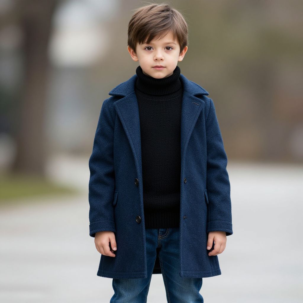 "kids coats boys costume, male focus, pants, 1boy, blurry background, sweater, outdoors, jeans, black sweater, blurry, denim, coat, jacket, brown hair, looking at viewer, short hair, turtleneck, solo focus, turtleneck sweater Realistic photo of casual sexy person with pretty face"