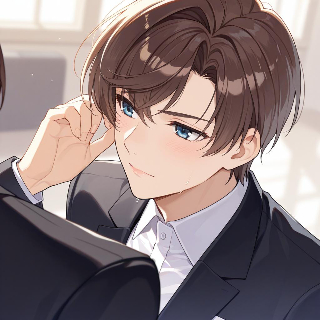 Artem wing (tears of themis), tears of themis, 1boy, blue eyes, brown hair, short hair, white shirt, collared shirt, black jacket, long sleeves, formal, by artist mitsuyo (mituyo324), illustrious
