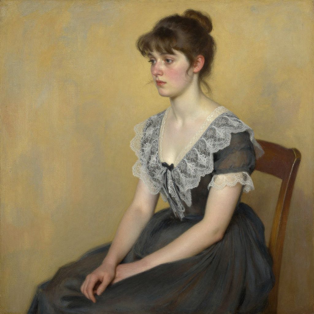 This is a photograph-style digital painting of a young Caucasian woman with pale skin and brown hair styled in a loose bun with bangs. She sits on a wooden chair against a beige, textured background, gazing to the left with a slight, contemplative smile. She wears a dark gray, Victorian-style dress with puffed sleeves and a large, intricate white lace collar that adds a delicate, elegant touch. Her arms rest gently on her lap, and the soft lighting highlights the gentle curves of her face and the fine details of her dress. The overall mood is serene and reflective.