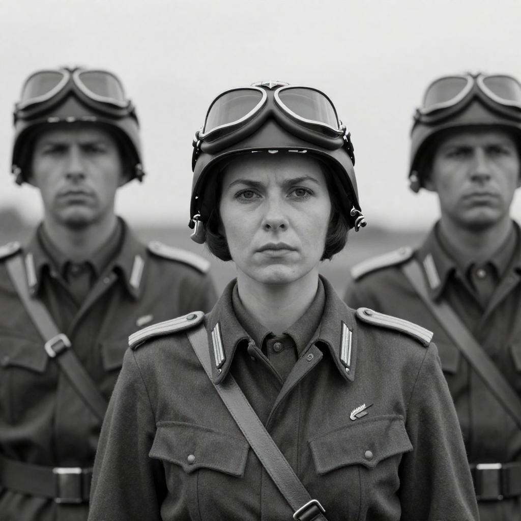 Black-and-white photograph of three WWII German soldiers. All wear helmets with goggles, dark uniforms, and epaulettes. Central woman has short dark hair, serious expression, RAF insignia on cap. Left and right men have focused expressions, shoulder straps, wing patches.