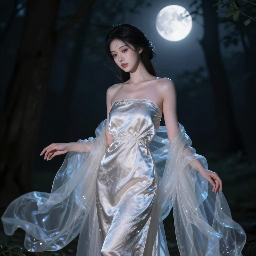 Fair skin black hair woman in a flowing silk gown standing in a moonlit forest, soft glowing light, delicate features, ethereal atmosphere, fantasy art style