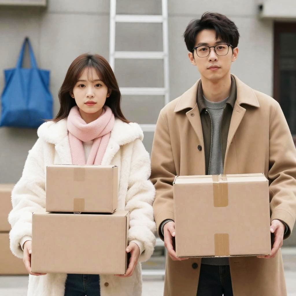 Photograph of two people standing outdoors. Man on right with dark hair, glasses, beige coat, green vest, holding cardboard box. Woman on left with long brown hair, white fur coat, pink scarf, holding two cardboard boxes. Background includes concrete wall and metal ladder. Both holding boxes, looking forward. Man's expression is neutral, woman's expression is neutral. Blue cloth bag in background.