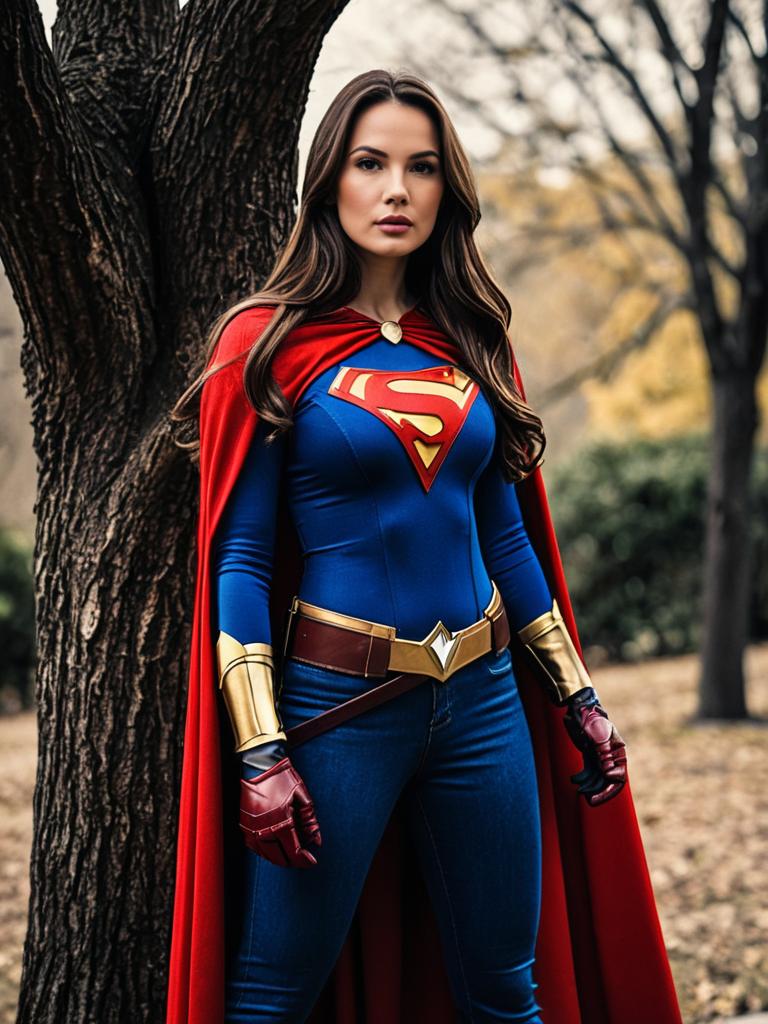 Woman wonder lady costume, 1girl, solo, long hair, cape, gloves, red cape, brown hair, superhero, belt, tree, looking at viewer, pants, blurry background, blurry, armor, outdoors