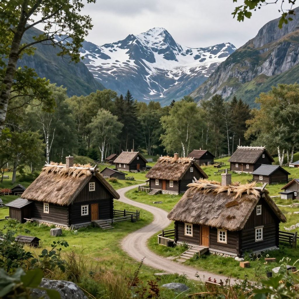 Photorealistic image of a Nordic Viking village featuring intricately detailed wooden houses with thatched roofs. The village is set in a lush green woodland glade, surrounded by tall trees and towering snow-covered mountains under soft dappled sunlight. Winding dirt paths connect the traditional homes, creating an immersive and authentic Nordic landscape.