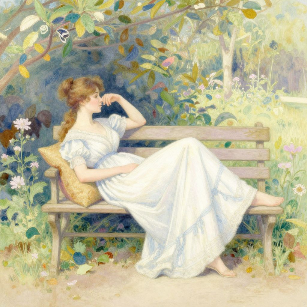 Whimsical painting of a brunette woman in a white dress, lounging on a wooden bench in a vibrant, sunlit garden.