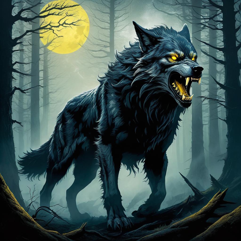 Fenrir – Monstrous wolf, son of Loki, depicted as an enormous, terrifying beast with razor-sharp teeth and piercing yellow eyes, set in an eerie dark forest shrouded in mist with the moonlight struggling to pierce through.