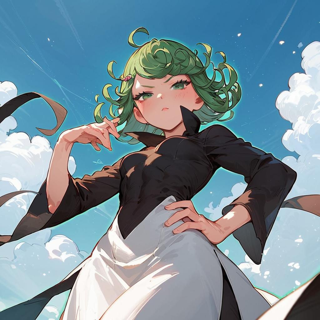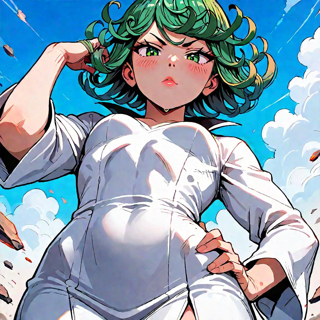 Score_9, source_anime, official art, tatsumaki, upper body, muscular, looking at viewer, mad, half-closed eyes, blush, frowning, standing, from below, dress, hand on hip, hand on hair