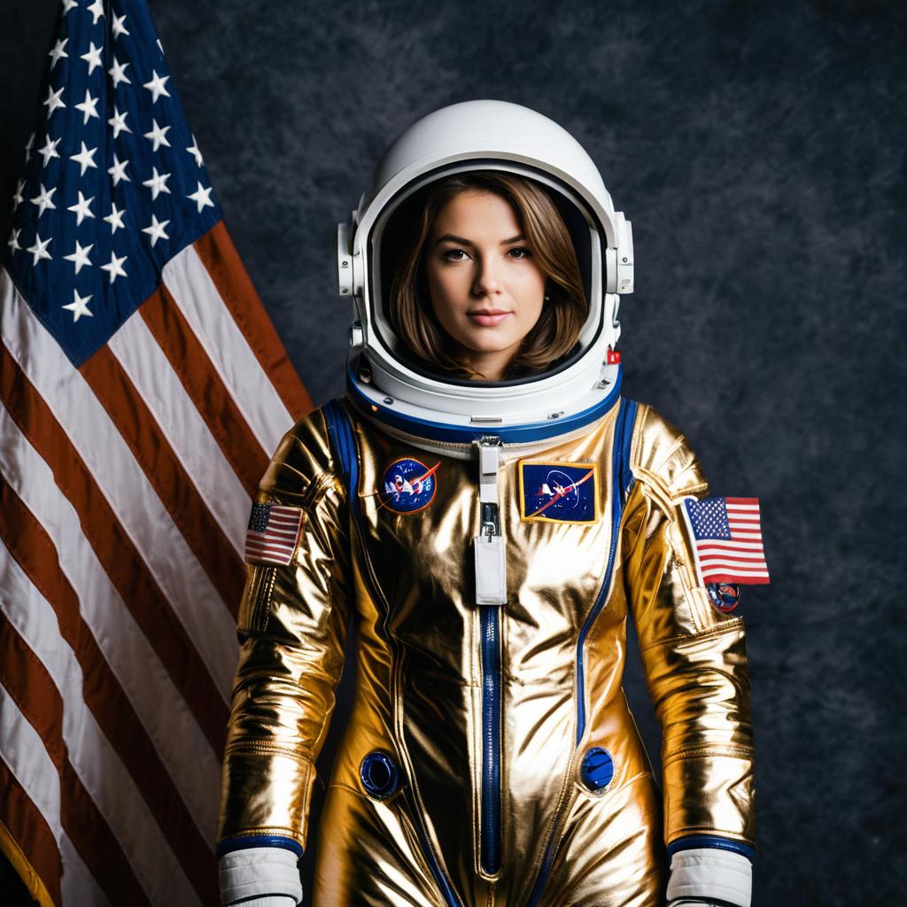 Portrait of a young woman wearing a silver NASA spacesuit and helmet. She is looking directly at the camera, with dark hair visible inside the clear space helmet. The spacesuit features NASA logos and American flag patches on both arms, representing a realistic astronaut costume.