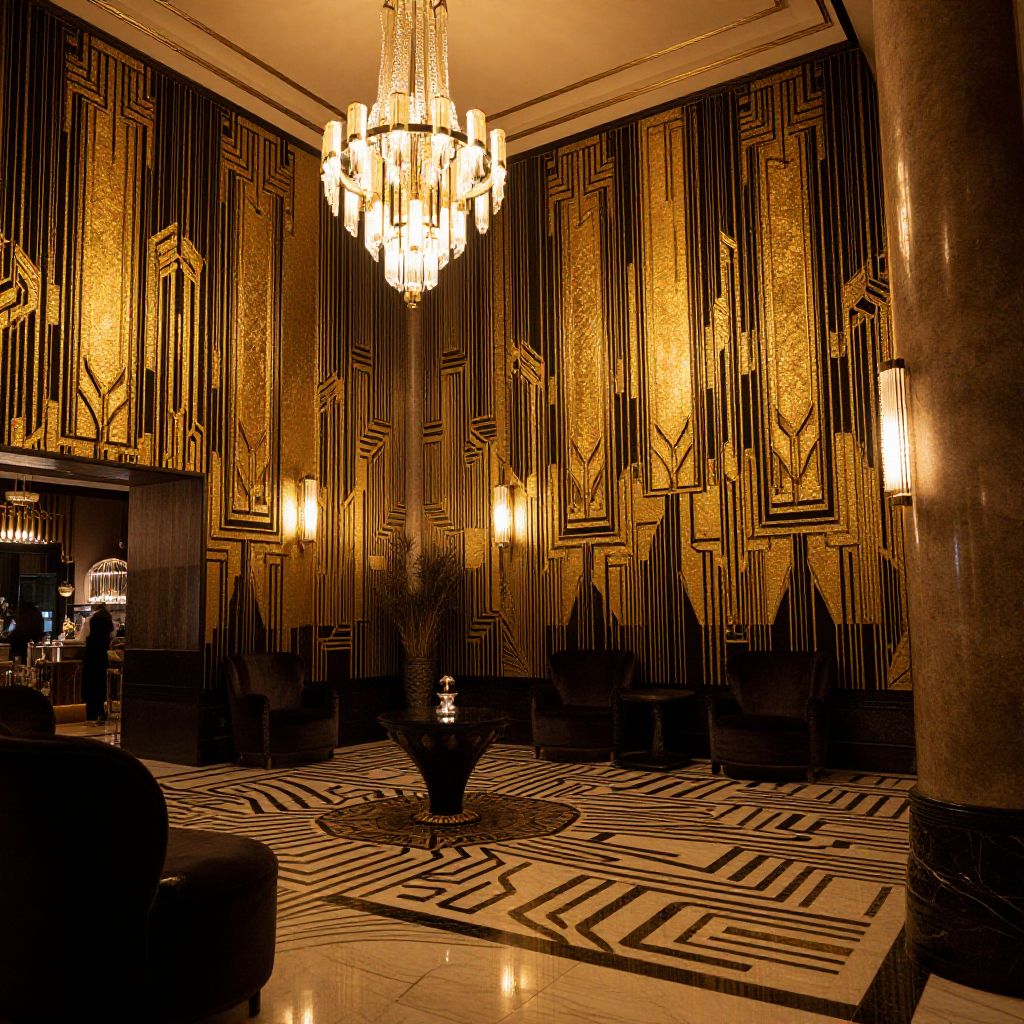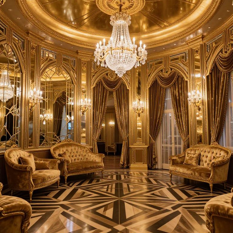 Art deco style décoration in a glamorous ballroom, golden accents, mirrored walls, crystal chandeliers hanging from ceiling, luxurious velvet curtains and furniture, geometric patterns on floors, opulent and radiant ambiance, highly detailed.