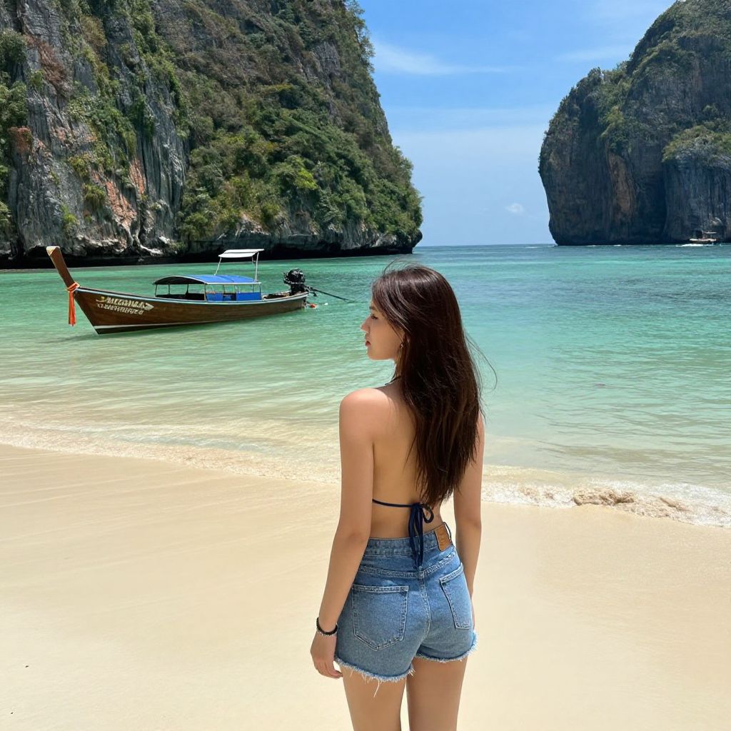 Back turned, a young woman stands on a pristine sandy beach in Thailand, gazing out at turquoise waters where two longtail boats drift near towering limestone cliffs under a clear blue sky.
