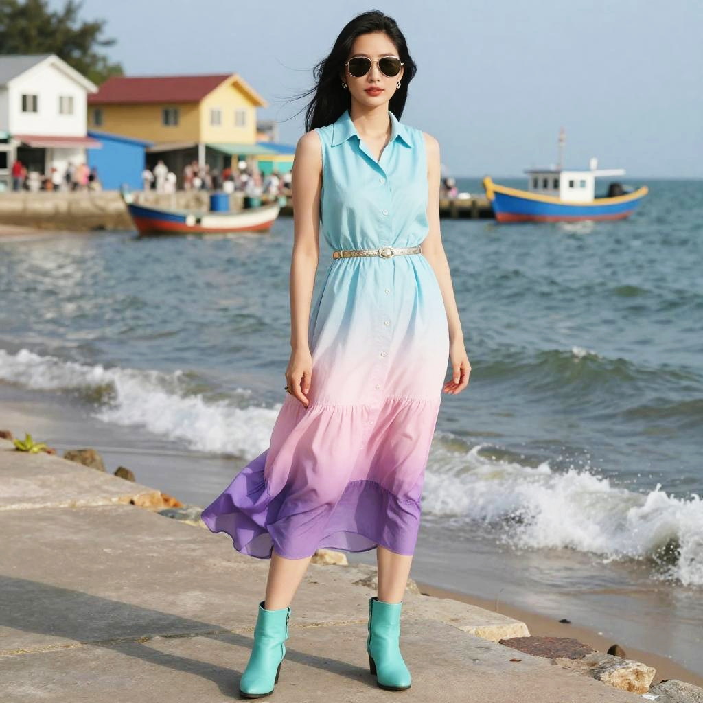 A woman in a contemporary casual style, wearing a sleeveless ombre shirtdress that transitions from light blue to pink and purple at the hem, cinched at the waist with a metallic belt, paired with aviator sunglasses and contrasting turquoise ankle boots. She stands on a fishing village seaside promenade, surrounded by the gentle sound of waves and the vibrant colors of the coastal scenery, in a visual style reminiscent of Yen Press. Sexy. Pretty face and beutiful eyes