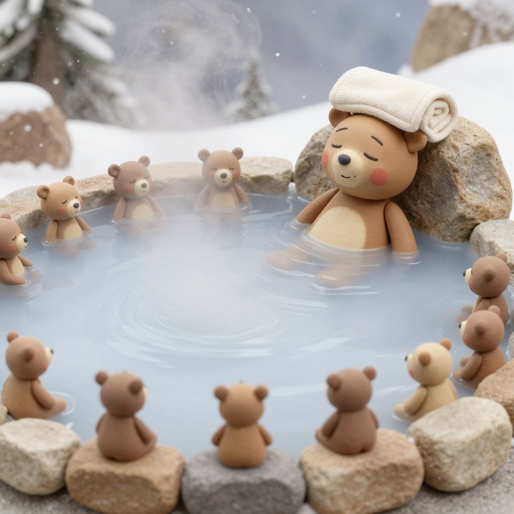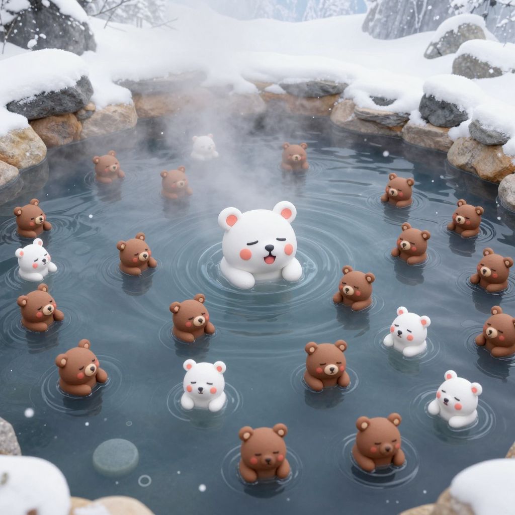Photograph of a whimsical, snowy outdoor hot spring scene featuring a group of cute, cartoon-like bears. Eleven brown bears and four white bears with rosy cheeks float in a circular arrangement on the dark, steaming water, creating ripples. The hot spring is surrounded by snow-covered rocks, with mist rising from the water. The background shows a snowy, forested area with bare trees. The bears have a chibi style, with large, expressive eyes and simple, rounded shapes, adding a playful, adorable touch to the wintry setting.