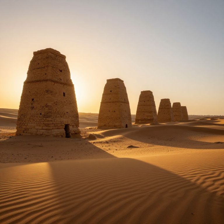 Photograph of ancient, sunlit sandstone towers in a desert, casting long shadows on rippled sand at sunset, with a clear, golden sky
