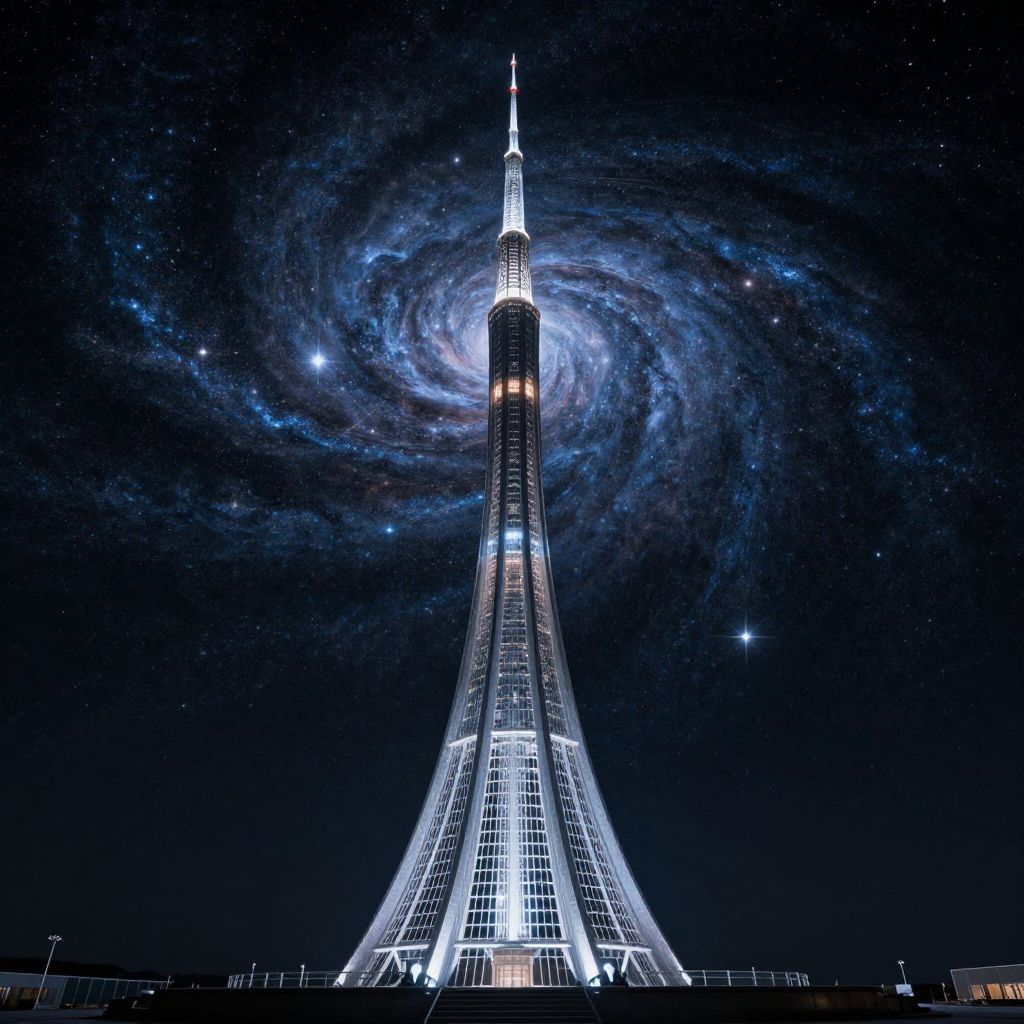 Under a celestial tapestry of swirling stars and cosmic whispers, a futuristic structure stands as a beacon of human ingenuity, inviting contemplation of our place within the infinite dance of the universe.